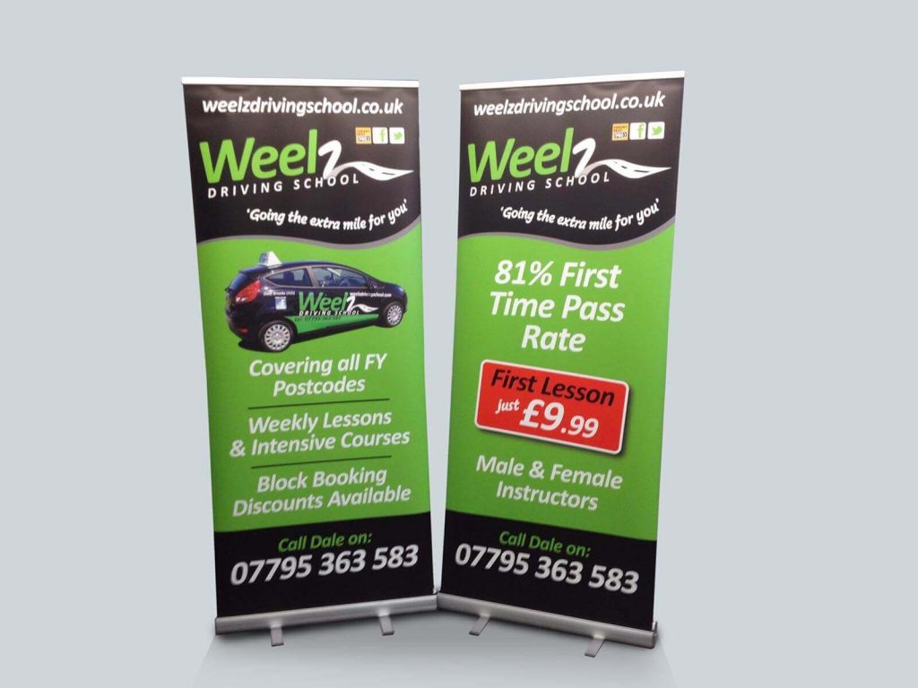 Roll-up banners are portable, lightweight and are a cost-effective way to capture the attention of passing audiences or even as promotional messages or as permanent fixtures. Frequently used at exhibitions to promote products.